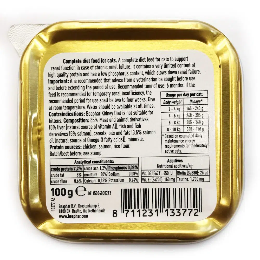 Beaphar專門為有腎臟或腎結石的問題而設計的貓濕糧。這種腎貓糧由最好的天然原料製成,不使用人造防腐劑,增味劑或其他添加劑。使用的蛋白質來源的質量確保最佳的消化率和高接受度。對於腎貓來說,不會增加不必要的腎臟負荷。因此這腎貓糧降低了磷含量和蛋白質含量。配方中含有鮭魚油,富含不飽和的歐米茄脂肪酸,對保持皮膚和毛髮健康至關重要,並有助於對抗慢性腎臟疾病。