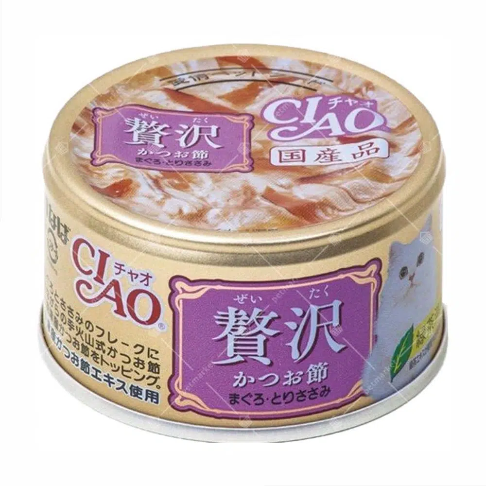 CIAO贅沢- 木魚片、吞拿魚、雞肉帝王三文魚、吞拿魚、雞肉貓罐頭 80g [A-145]