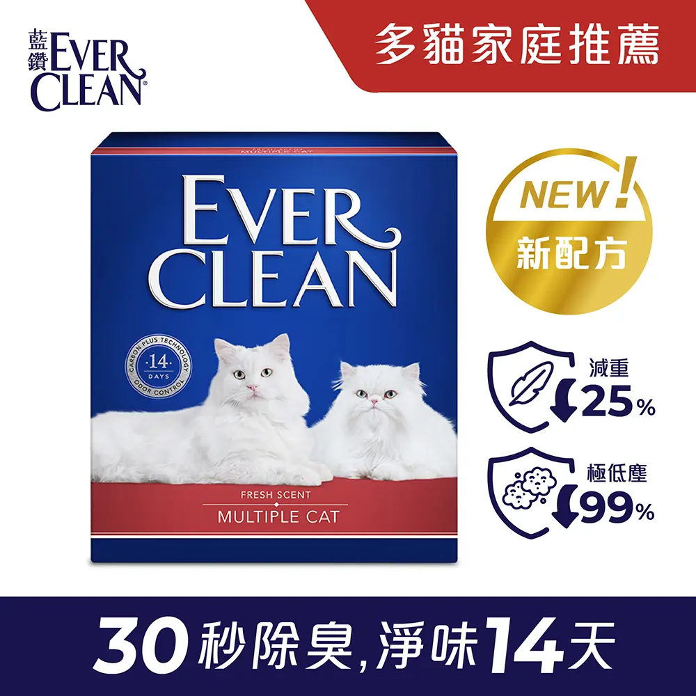 Ever Clean 愛牠潔「特強多貓配方貓砂(芳香)」專為多貓家庭與氣味強烈環境設計,結合高效活性炭除臭與持久芳香技術,能迅速鎖住異味並釋放清新香氣。