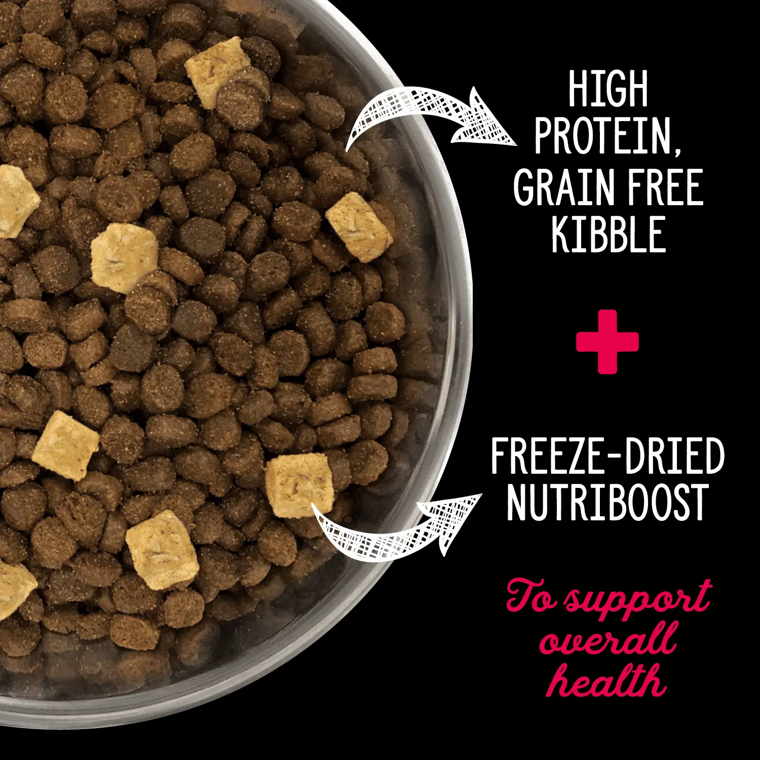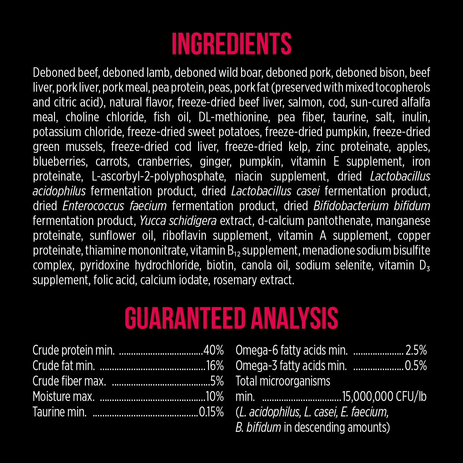 去骨牛肉, 去骨羊肉, 去骨野豬肉, 牛肝, 羊肝, 野豬肝, 去骨美國野牛, 豬肉粉, 羊肉粉, 鮭魚, 鯡魚, 鱈魚, 鱈魚肝, 青豌豆, 豬油 (以維生素E保存),整顆雞蛋, 紅扁豆, 紅薯, 鷹嘴豆, 天然豬肉風味, 曬乾苜蓿粉, 牛肝凍乾, 南瓜凍乾, 綠貽貝凍乾, 鱈魚肝凍乾, 海帶凍乾, 鮭魚油, 鯡魚油, 椰子油, 南瓜, 胡桃南瓜, 紅蘿蔔, 波菜, 花椰菜, 蘋果, 藍莓, 小紅莓, 紅石榴, 杜松子萃取物, 生薑, 茴香, 洋甘菊, 薄荷葉, 甘草根, 薑黃, 纈草根, 維生素 (維生素E補充, L-抗壞血酸(維生素C ), 維生素A補充, 菸鹼酸(維生素B3), 泛酸鈣(維生素B5), 肌醇(維生素B8), 核黃素(維生素B2), 鹽酸吡哆辛(維生素B6), 硫胺(維生素B1), 生物素(維他命B7), 維生素B12補充, 維生素D3補充, 葉酸(維生素B9) ), 礦物質 (氧化鋅, 蛋白鋅, 蛋白鐵, 硫酸亞鐵, 蛋白銅, 硫酸銅, 蛋白錳, 氧化錳, 碘酸鈣, 亞硒酸鈉), 氯化鉀, 氯化膽鹼, 鹽, 牛磺酸, DL-甲硫氨酸, L-離胺酸, 菊苣根萃取物, 麟鳳蘭絲蘭萃取物,酵母萃取物, 百里香萃取物, 鹽酸鹽葡萄糖胺, 迷迭香萃取物, 軟骨素, 左旋肉鹼, 乾胚芽乳酸菌, 腸球菌, 乾枯草桿菌, 乾動物雙叉乳酸桿菌, 乾酪乳桿菌, 乾瑞士乳酸桿菌, 比菲德氏菌, 嗜酸乳桿菌
