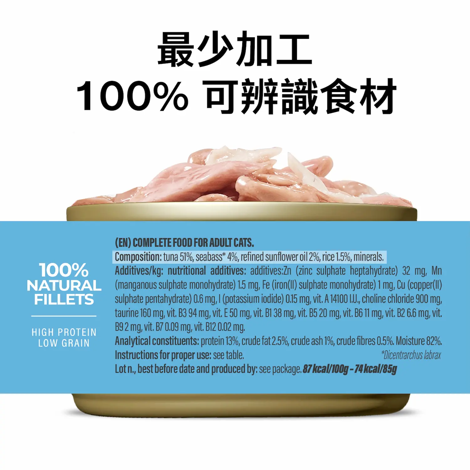 Schesir 採用真正蒸煮的吞拿魚與鱸魚製成,配方天然簡單,以高品質魚肉作為主要蛋白來源,質地柔軟的啫喱口感特別適合挑食貓。配方高蛋白、低碳水,同時有助補充水分,全面照顧貓咪日常營養與健康需要。