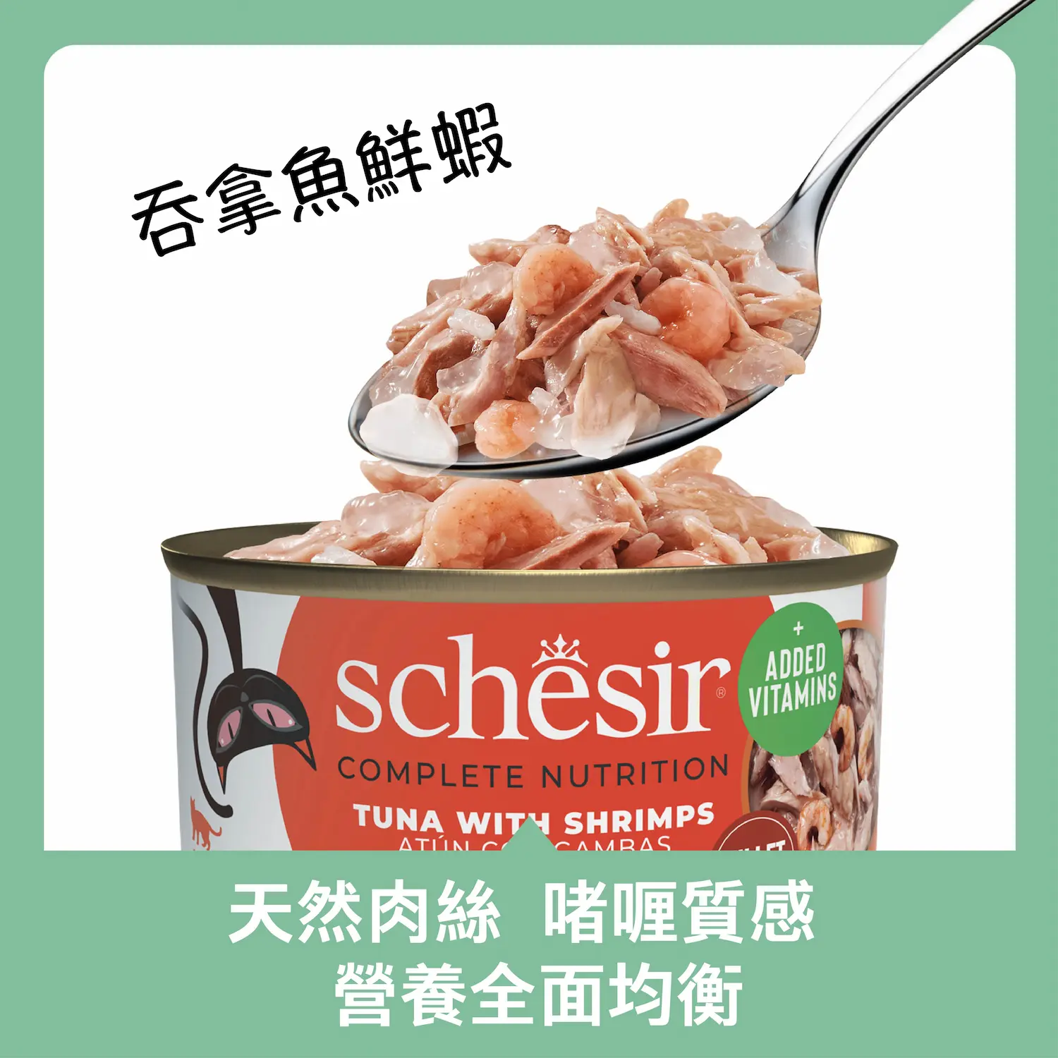 Schesir 採用真正蒸煮吞拿魚配搭鮮甜蝦肉製成,口感天然細緻,結合清爽啫喱質地,香氣誘人,特別適合挑食貓。配方屬完整主食級(Complete),提供均衡營養,高蛋白、低碳水,有助維持貓咪理想體態與每日活力。