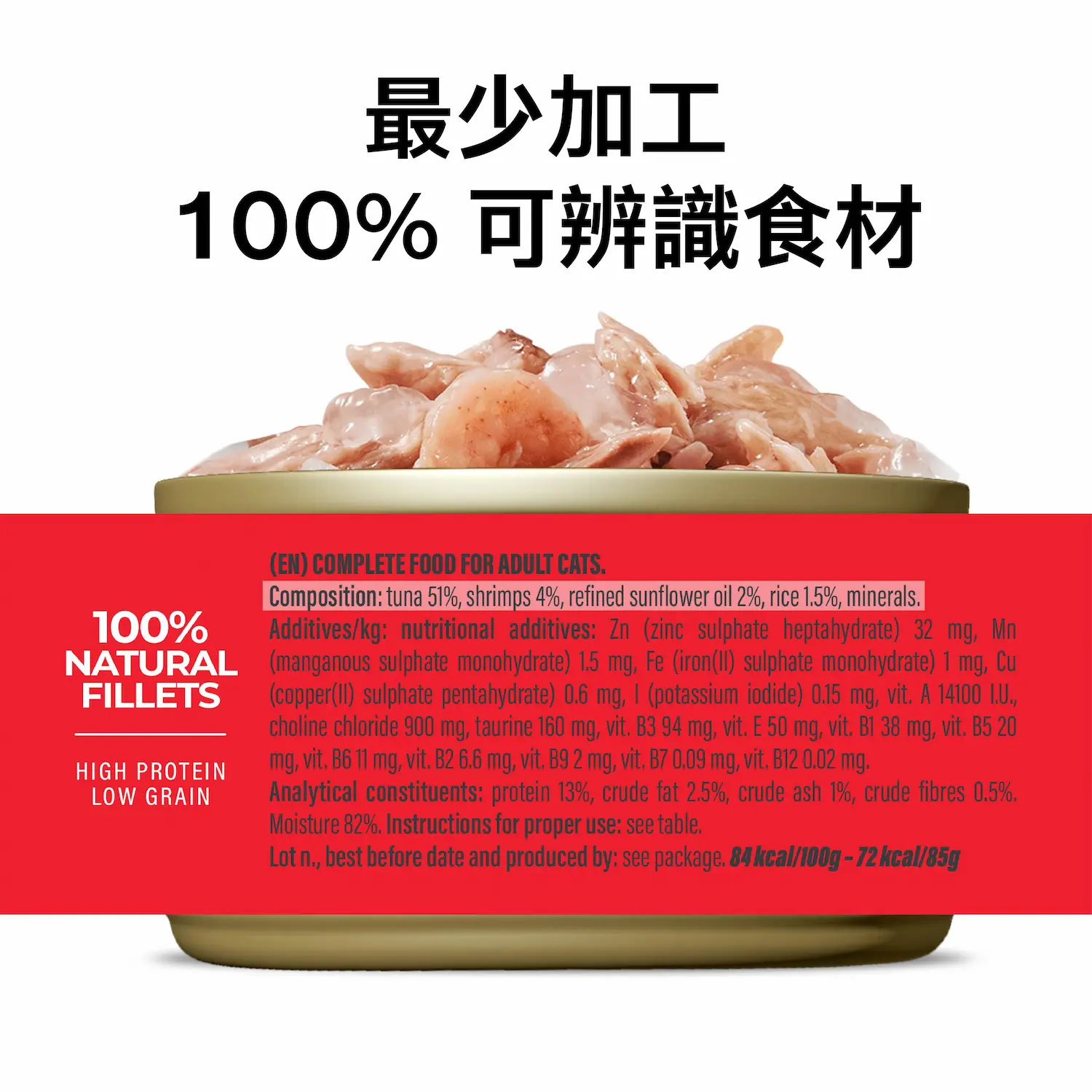 - 高蛋白、低碳水 – 以吞拿魚及蝦作主要蛋白來源,更貼近貓咪天然飲食。
