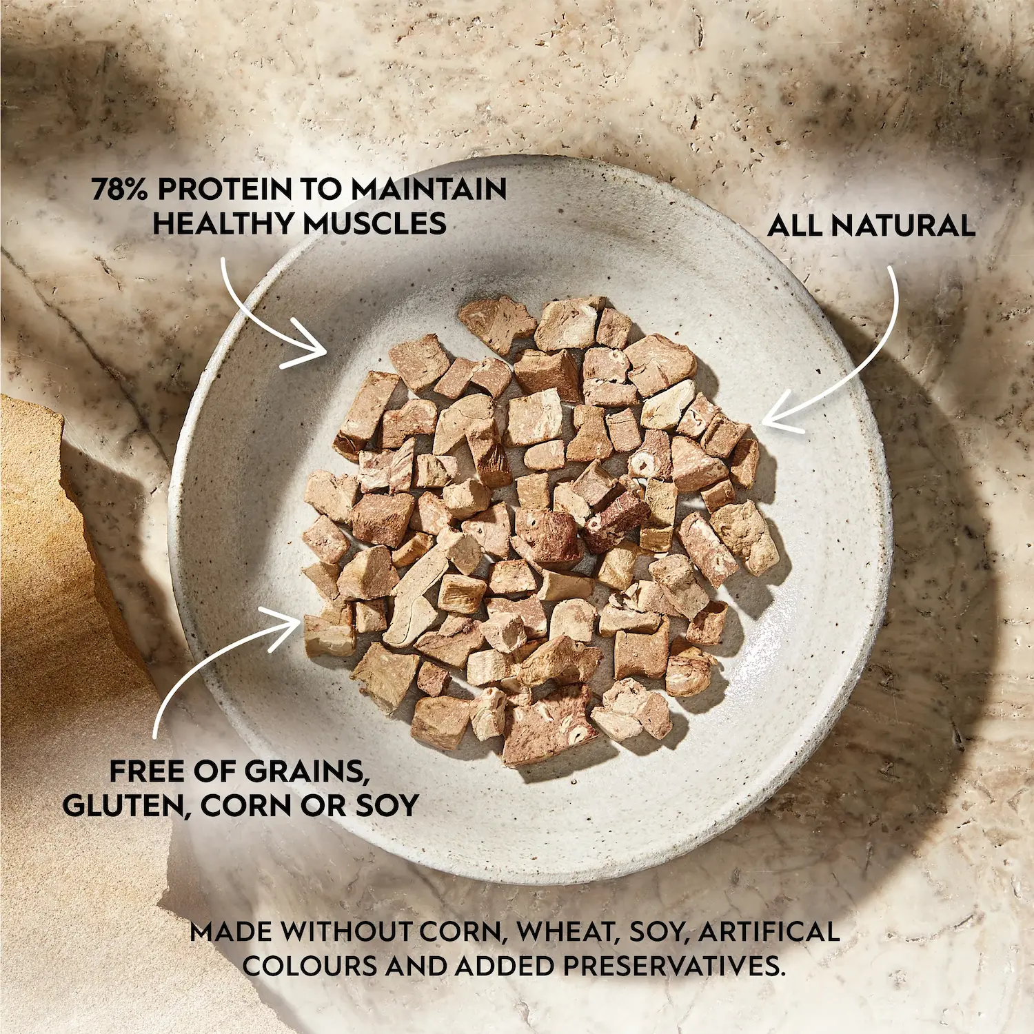 - 高嗜口性與提升食慾 – 凍乾保留肉香,可直接餵或作拌食增香(Meal Topper)。