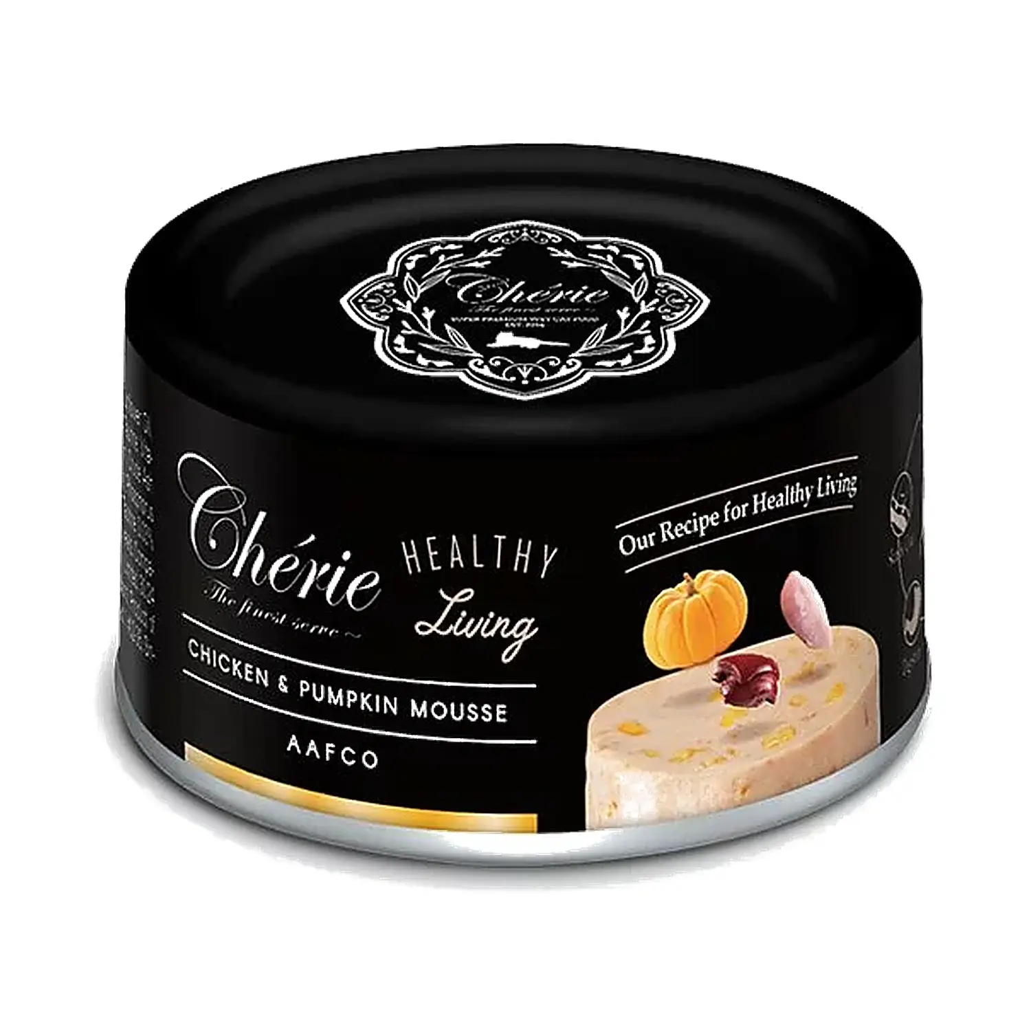 Cherie 法麗全照護主食貓罐選用雞肉配搭南瓜製作,質地細膩綿滑,天然味道更易入口。配方模擬貓咪天然狩獵飲食,並加入牛磺酸、果寡糖及多種維他命與礦物質,為貓咪提供完整均衡營養,適合作為每日主食。