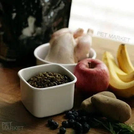 Fresh Turkey meat, chicken meal, sweet potato, dehydrated peas, chicken fat, (preserved with mixed tocopherols form of vitamin E), dehydrated whole egg, fresh ocean fish (Atlantic Cod), dehydrated chicken flavor (liver), salmon oil, lecithin, rosemary extract, taurine, Dried kelp, chickory root & yeast extract (FOS & MOS) yucca schidigera extract, dehydrated vegetables & fruit: pumpkin, cranberries, spinach, broccoli, green apples, blueberries, pears, bananas, turmeric, dandelion, paprika. Vitamins: choline chloride, vitamin E, thiamine mononitrate, vitamin A, vitamin B12, vitamin K1, riboflavin, biotin, vitamin D3, folic acid, pyridoxine hydrochlorid. Chelated minerals and minerals: potassium chloride, calcium carbonate, sodium chloride, zinc proteinate, iron sulfate, sodium selenite, manganese sulfate, calcium iodate, calcium pantothenate, cobalt carbonate, whey protein.