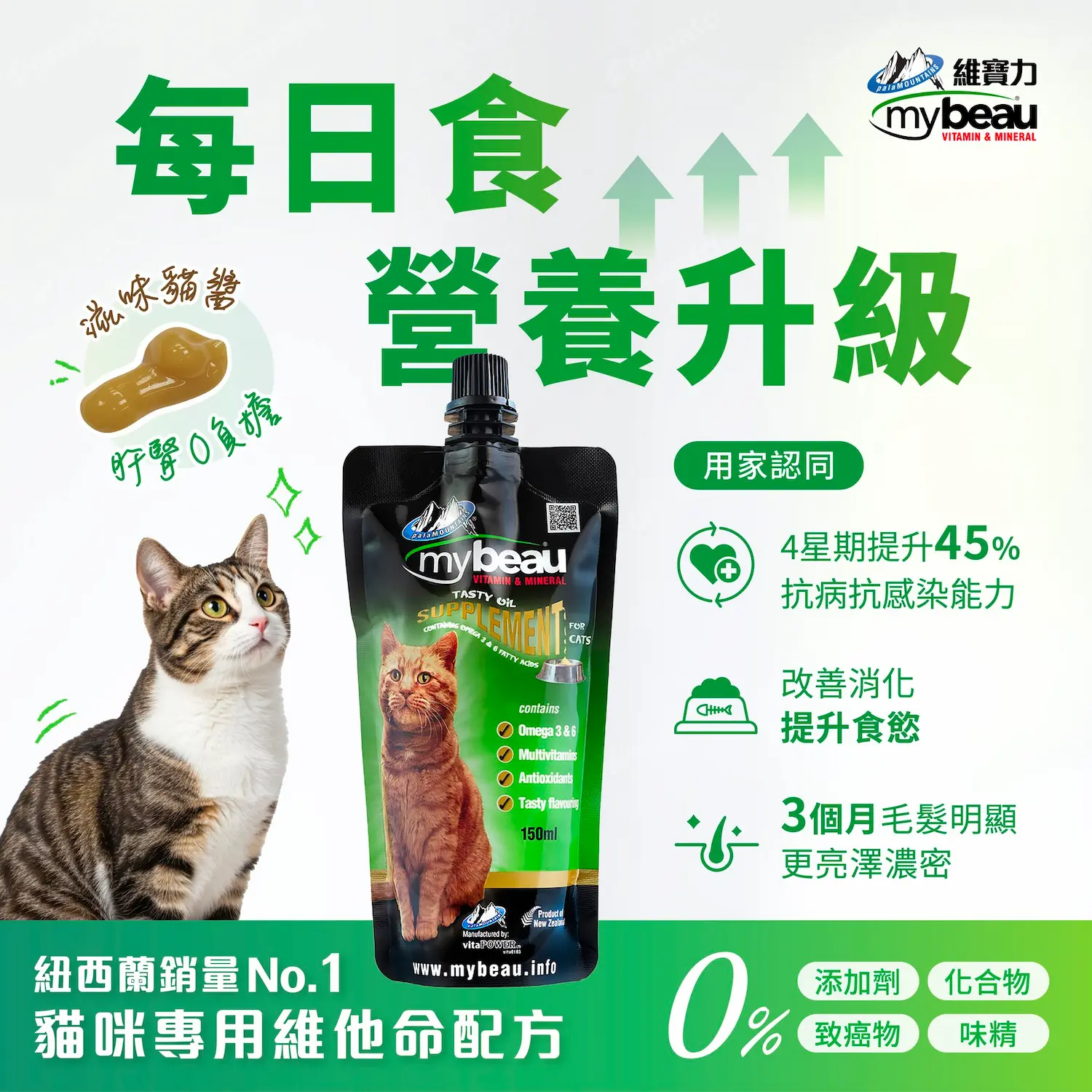 MyBeau 專利維他命營養貓配方為紐西蘭 palaMOUNTAINS 科學研發之液態啫喱型寵物營養補充劑。產品結合 Omega 3 & 6 必需脂肪酸、水溶性(B 群)及脂溶性(A、D、E)維他命等營養成分,吸收率高達 99.5%,幫助補充日常膳食中流失或不足之營養,從而提升免疫力、增強體質、改善皮膚及毛色、提升食慾及促進消化健康。配方不含添加劑、致癌物及味精,適合 12 星期以上貓隻每日使用。 :contentReference[oaicite:1]{index=1}