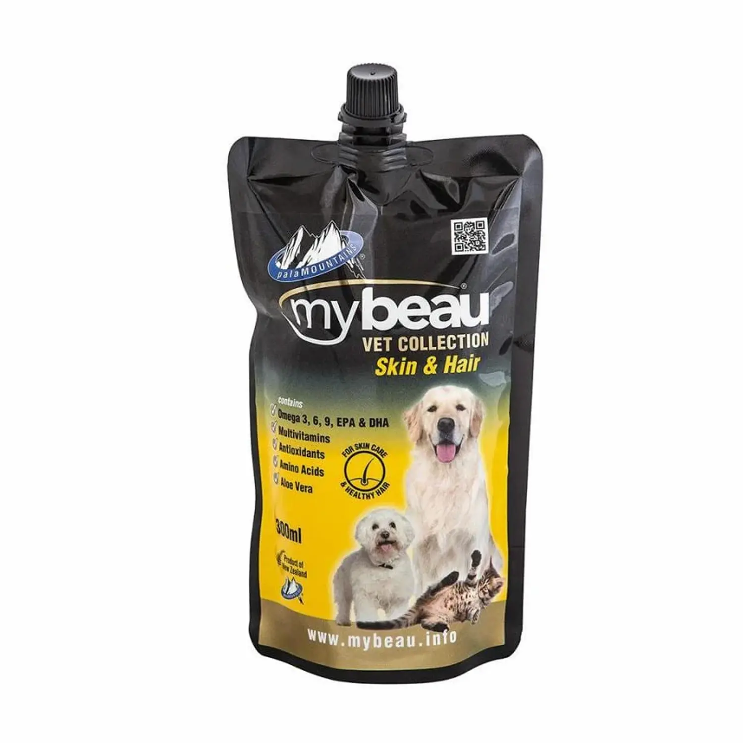MyBeau Skin & Hair 護理啫喱由紐西蘭 palaMOUNTAINS Vet Collection 研發,專為犬貓皮膚健康及光澤毛質而設。配方融合蘆薈、胺基酸(如 L-Cysteine HCL、L-Methionine、L-Carnitine)、紐西蘭亞麻籽油、鮭魚油、Omega-3/6、EPA & DHA、多種維他命及抗氧化營養素,支援細胞健康、免疫防護、毛髮強韌及解決乾燥、脫毛等皮膚毛髮困擾。