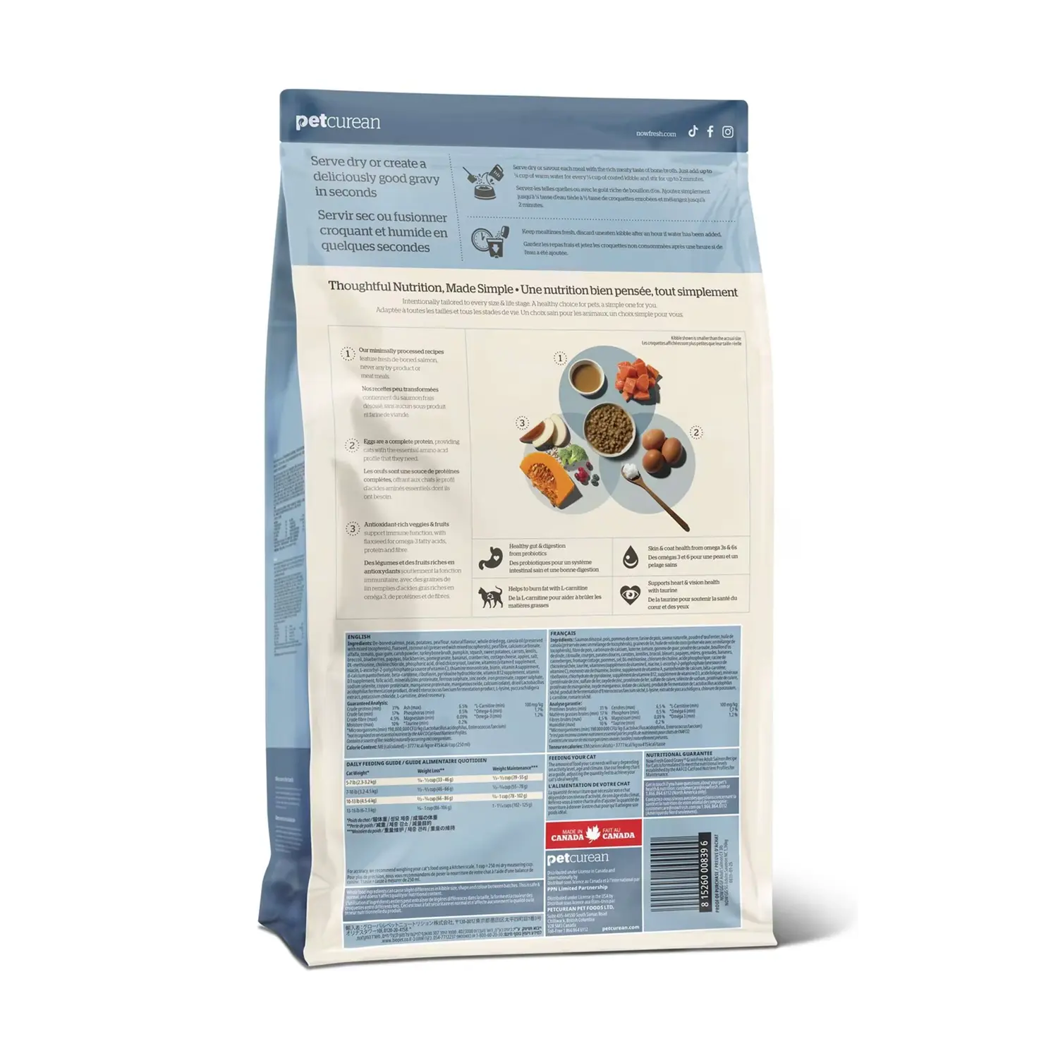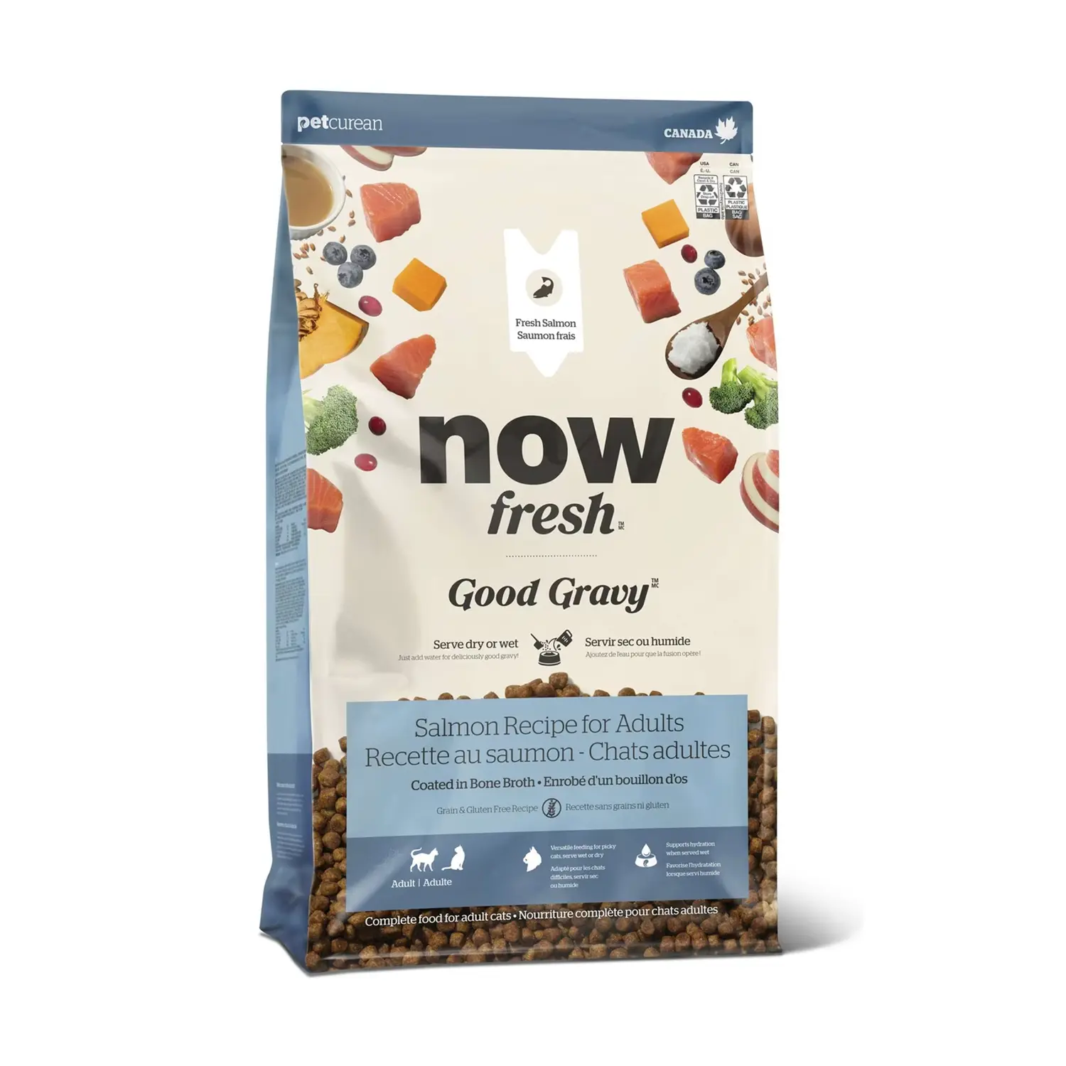 Now Fresh – 香濃骨湯外層乾糧以去骨三文魚為主要蛋白來源,配合火雞骨湯香濃塗層,乾食或加少量溫水拌食皆宜。配方無穀、無麩質,加入南瓜、番薯、亞麻籽及益生菌,有助腸胃健康與毛髮亮澤。適合成貓及高齡貓食用。