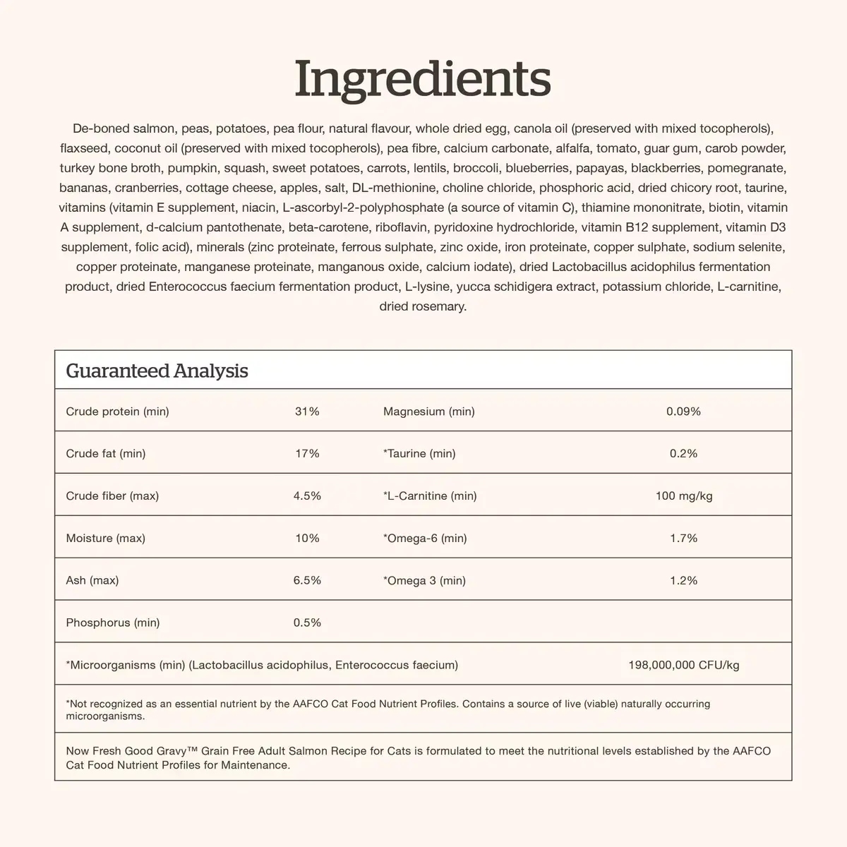 去骨三文魚、豌豆、馬鈴薯、豌豆粉、天然香料、全蛋粉、芥花籽油(以混合生育酚保存)、亞麻籽、椰子油(以混合生育酚保存)、豌豆纖維、碳酸鈣、苜蓿、番茄、瓜爾膠、角豆粉、火雞骨湯粉、南瓜、番薯、紅蘿蔔、扁豆、西蘭花、藍莓、木瓜、黑莓、石榴、香蕉、蔓越莓、乾酪、蘋果、鹽、DL-蛋胺酸、膽鹼氯化物、磷酸、乾菊苣根、牛磺酸、維生素(維生素E補充劑、菸鹼酸、L-抗壞血酸-2-聚磷酸鹽〔維生素C來源〕、硫胺素、D-泛酸鈣、維生素A補充劑、生物素、核黃素、維生素B12補充劑、維生素D3補充劑、β-胡蘿蔔素、葉酸)、礦物質(鋅蛋白鹽、硫酸亞鐵、氧化鋅、鐵蛋白鹽、硫酸銅、錳蛋白鹽、銅蛋白鹽、氧化錳、碘酸鈣)、乾嗜酸乳桿菌發酵物、乾糞腸球菌發酵物、L-肉鹼、乾迷迭香、氯化鉀、L-離胺酸、絲蘭萃取物。