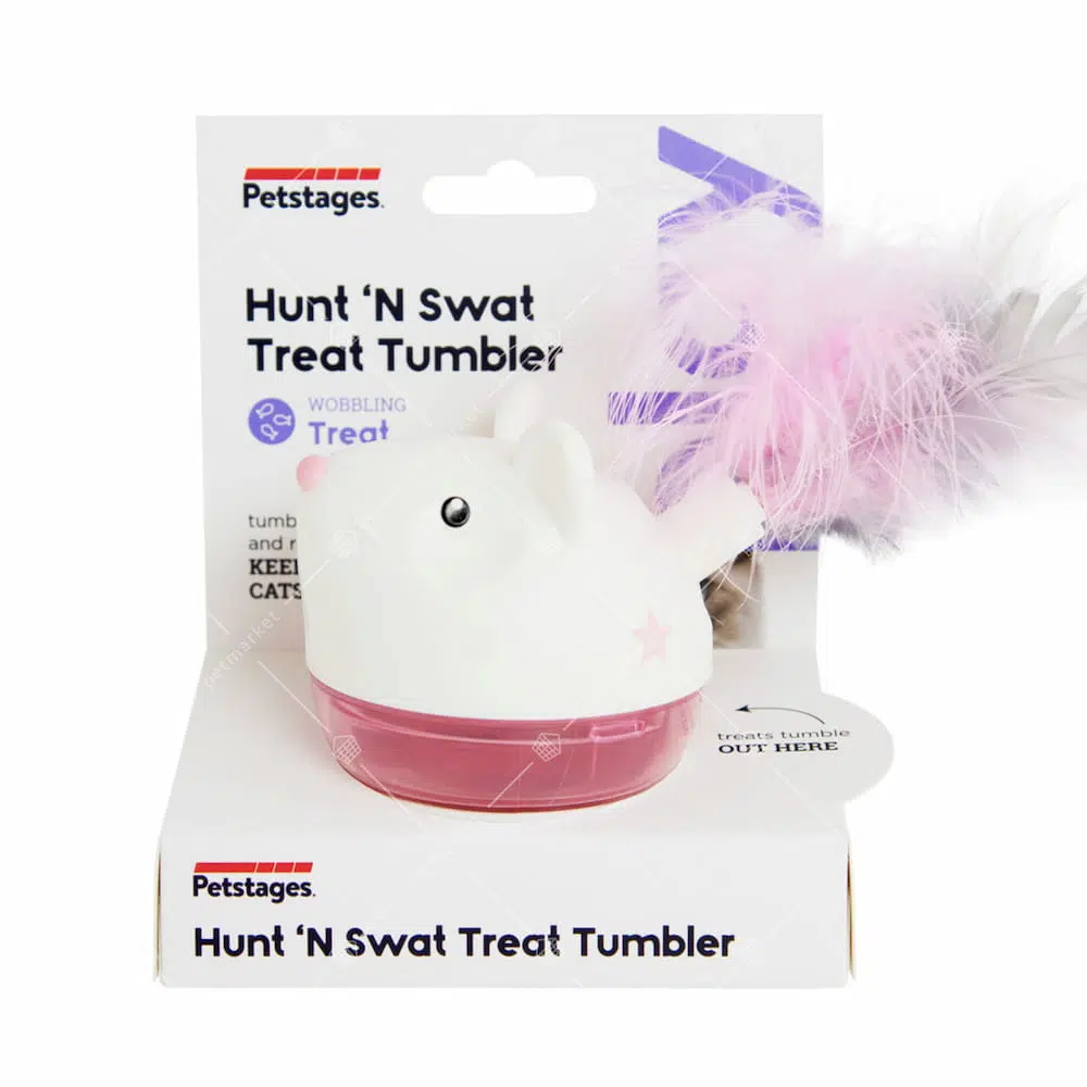 Petstages Hunt ‘N Swat Treat Tumbler 讓好奇的貓保持忙碌。Hunt ‘N Swat 會隨著貓的拍打和拍打而搖晃和滾動。不可預知的動作讓貓保持參與。