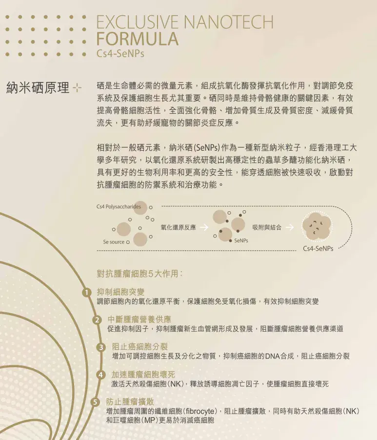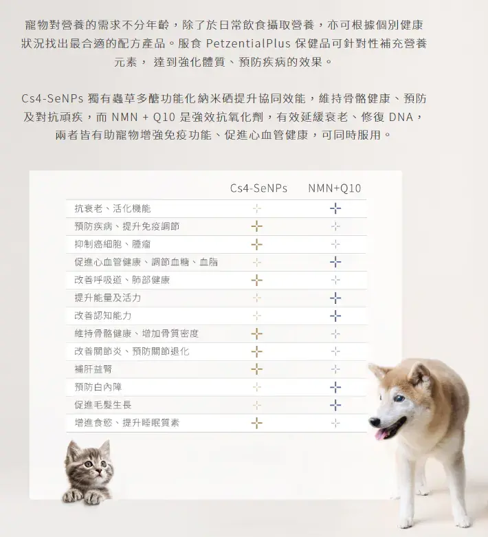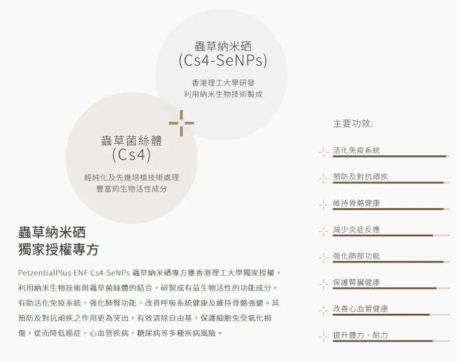 Petzential Plus – Cs4-SeNPs 蟲草納米硒專方係一款為犬、貓設計嘅功能性營養補充品,結合蟲草菌絲體(Cs4)與納米硒(SeNPs)生物技術,提升吸收率及協同效能,有助活化免疫系統、抗氧化及維持整體健康。產品採用香港理工大學研發技術,適合日常保健或體弱調理使用。