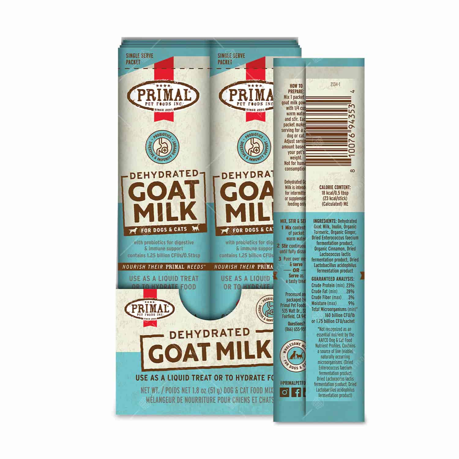 Primal – Dehydrated Goat Milk Sticks 支裝脫水山羊奶粉,提供豐富營養補充,輕鬆為日常飲食添加必要水分,並含有益生菌,有助維持消化系統及免疫健康的平衡。選用經認證人道飼養的山羊奶源,原料品質優良。使用方式簡便,只需與溫水混合後,即可倒入寵物餐點中或作為美味零食單獨餵食。產品在美國製造,不添加人工色素及大豆,包裝為十支裝小盒,便於保存與使用。為您的愛寵提供溫和的營養支持,幫助維持整體活力。Primal,堅持最高的品質和安全標準。