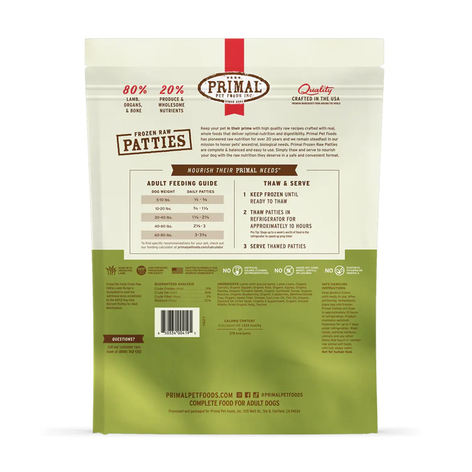 Primal 急凍鮮肉餅(草飼羊肉配方)選用負責任飼養的草飼羊肉製成,不含類固醇或額外添加荷爾蒙。產品以急凍保存及低溫加工技術製作,有效保留天然營養與活性。經同儕審查研究證實,比高溫烹煮食品更易消化,有助維持腸道健康。特大份量設計,適合大型犬及多犬家庭,可作為主食、拌糧或營養補充,並以全食物營養配方製作,不含合成維他命或礦物質。