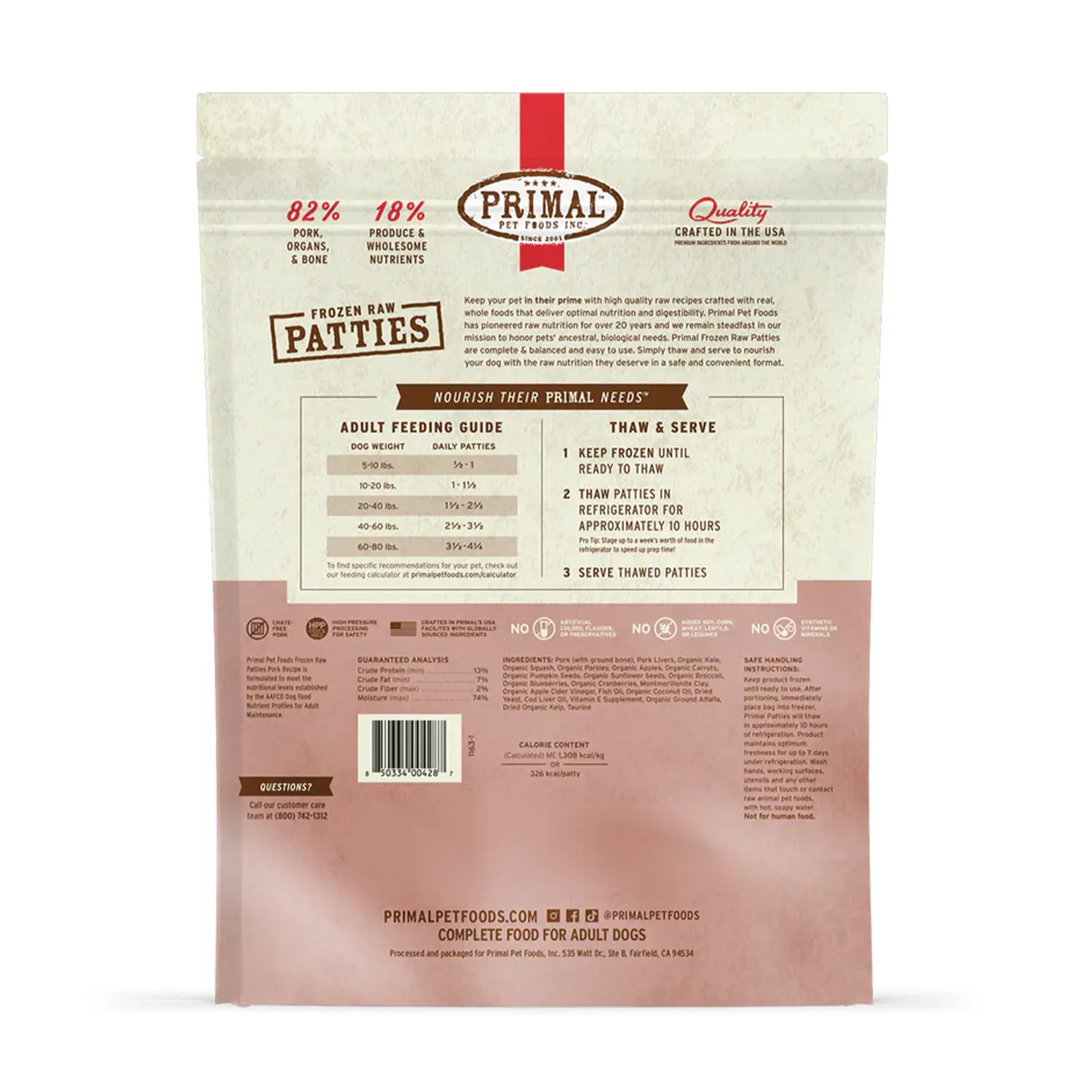 Primal 急凍鮮肉餅(走地配方)選用非籠飼養豬肉製成,不含抗生素、類固醇或額外添加荷爾蒙。產品以急凍保存及低溫加工技術製作,有效保留天然營養與活性。經同儕審查研究證實,比高溫烹煮食品更易消化,有助維持腸道健康。特大份量設計,適合大型犬及多犬家庭,可作為主食、拌糧或營養補充,並以全食物營養配方製作,不含合成維他命或礦物質。