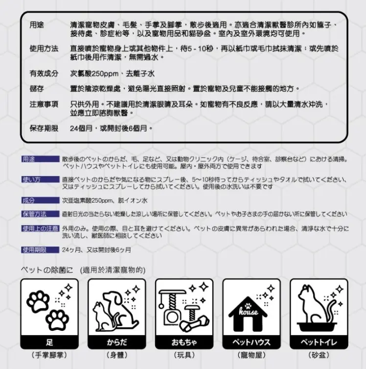 只供外用,請勿直接噴於寵物身上。如寵物出現不良反應,請立即以大量清水沖洗,並諮詢獸醫。