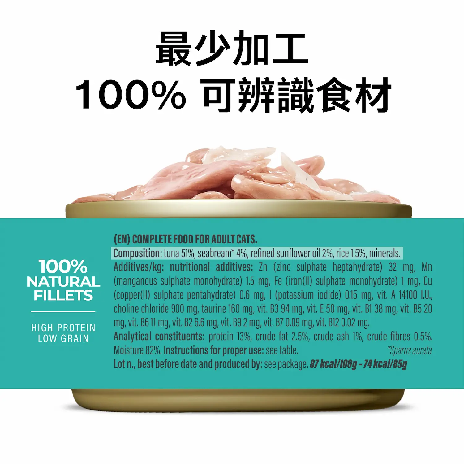 吞拿魚 51%、鯛魚 4%、米 1.5%、精製葵花籽油 2%、礦物質